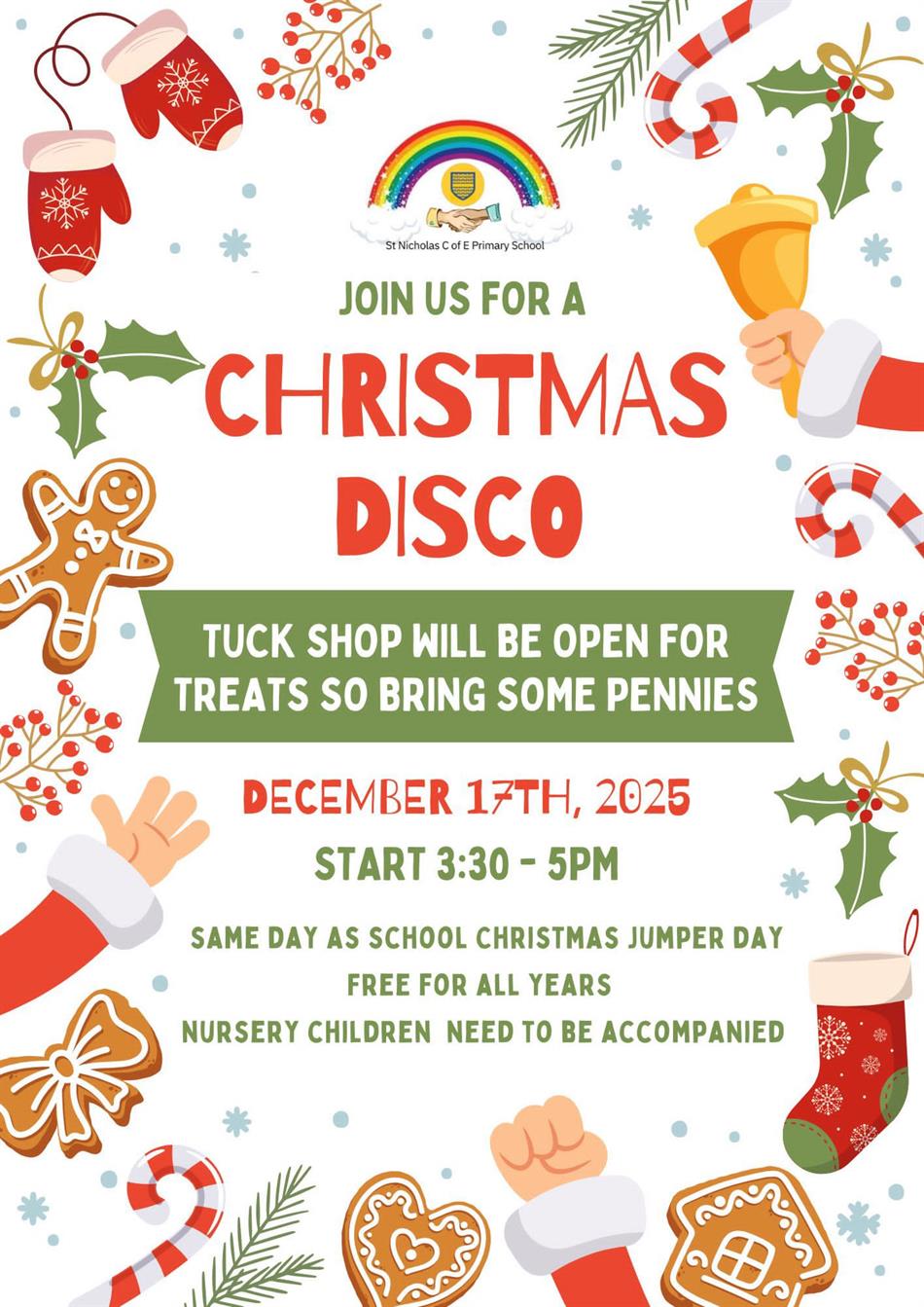 Christmas Disco in the school hall on Wednesday 17th December, 3:30pm until 5pm. The disco is free to attend, and a tuck shop will be available for children to purchase snacks. Nursery children must be accompanied by a parent or carer please, unless they are already signed up for after-school care that day.