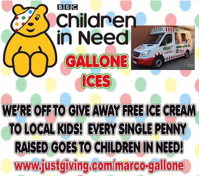 Gallone Ices will be in West Tanfield on Monday 10th November at 3.30pm in the Memorial Hall car park.  Free ice creams in return for a donation for Children in Need – see below: