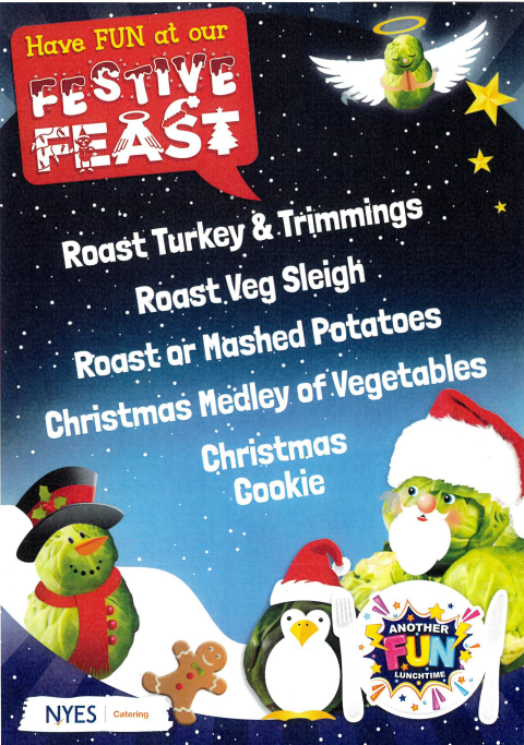 Wednesday 17th December. All children are welcome to have the ‘festive feast’ regardless of whether they usually have a school dinner or not. There will be no jacket potato or sandwich options on that day. Please respond to the email sent out previously
