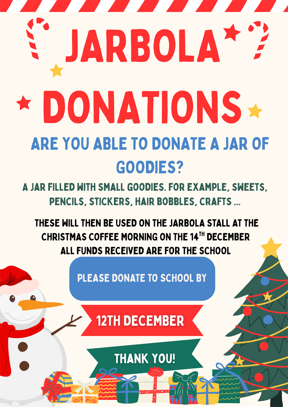 Sunday 14th December, 10am - 12 noon. Tea, cake and coffee will be available to purchase. There will be fair stalls, crafts and the opportunity for the children to meet Santa! If anyone is able to donatea jar for the ‘jarbola’ for the Christmas coffee morning, please see below for more details…